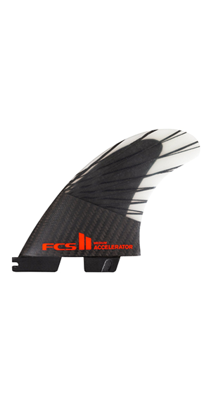 The Accelerator PC Carbon fins have a lighter construction and smoother feel. The new PC Carbon Essential Series utilizes a superior blend of carbon tissue and ultralight AirCore construction to deliver a more user-friendly flex to achieve faster startup acceleration and a smoother feel through turns. These fins are designed for a balance of speed, flow & response with added control. The oversized, all-round template has a fuller tip. The PCC is ideal for surfers who like to attack the wave and perform aggressive turns. These fins will perform well in a wide range of conditions, particularly good in critical overhead waves.