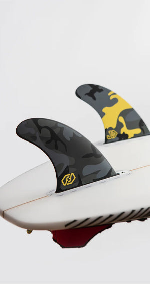 "New Athlete series for one of the best European surfers who ran the CT last year and was inspired by his fovoutire template throughout the competition, with a black, gray and yellow tonal camouflage pattern, he will take this fins into battle to re-enter the highest competition next year.